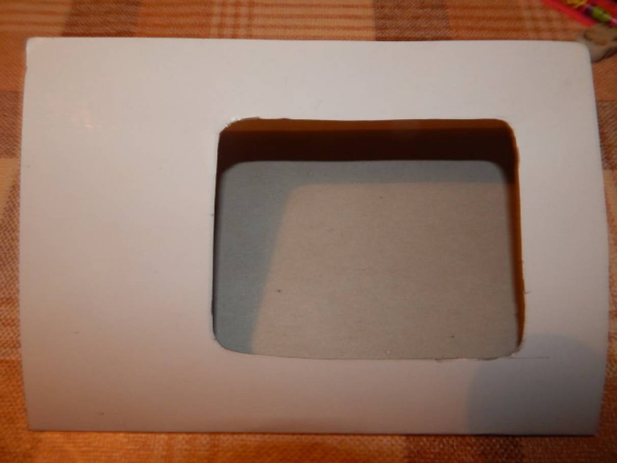 Из картона вырезаем макет будущей рамки, размечаем место для фотографии, аккуратно вырезаем «окошко».