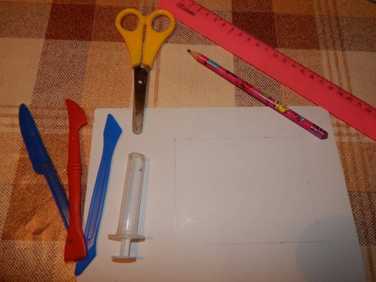 Приготовим картон, ножницы, линейку, стеки, карандаш, гуашь разного цвета.