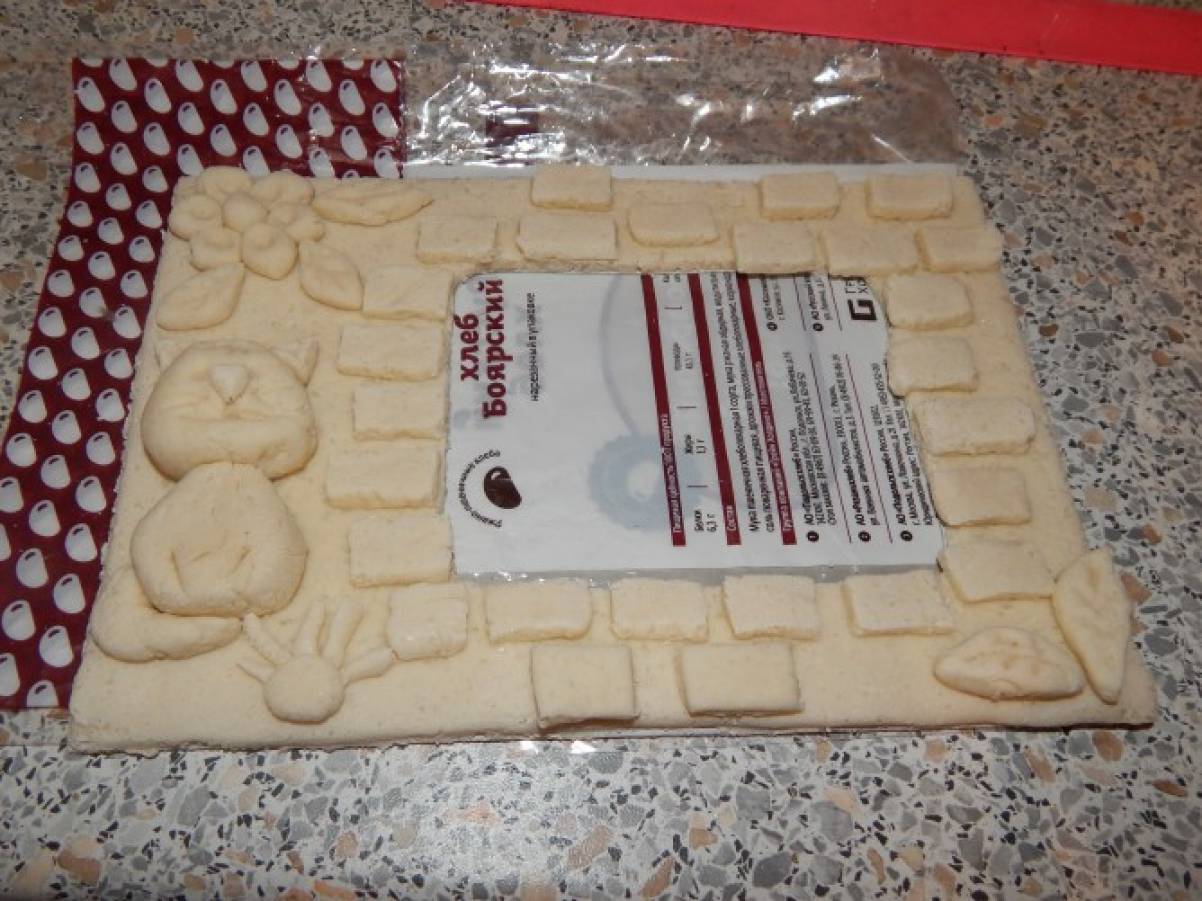 Украшаем рамку прямоугольниками из теста. Лепим фигурки, накладываем их на рамку.