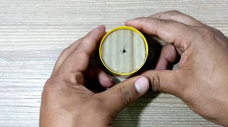 Шпажка должна пройти крышку через верхнее отверстие и через нижнее, в картонном кружке. Тогда вся модель будет устойчива. Для надежности деревянную палочку приклеивают к месту выхода внизу подставки.