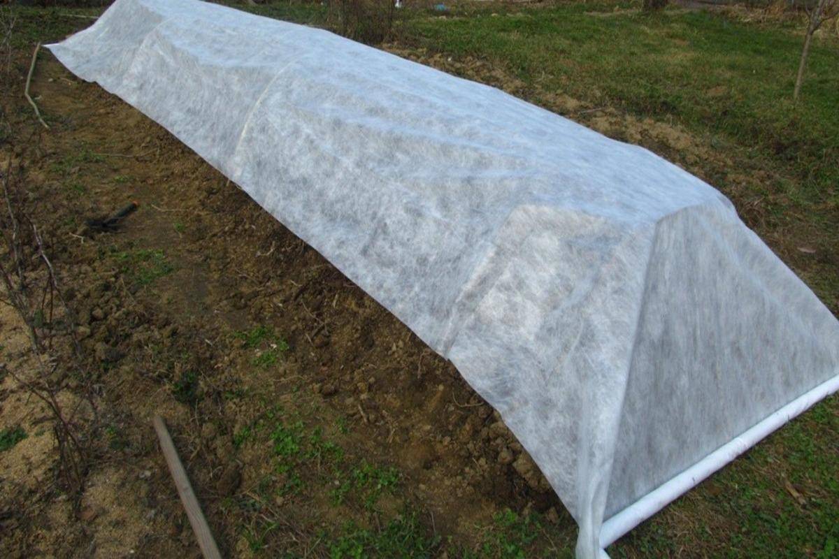 После изготовления конструкции ее накрывают укрывным материалом, спанбонд натягивают, прижимают к земле любыми подручными средствами (кирпичами, досками).