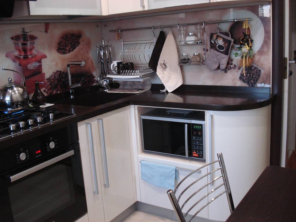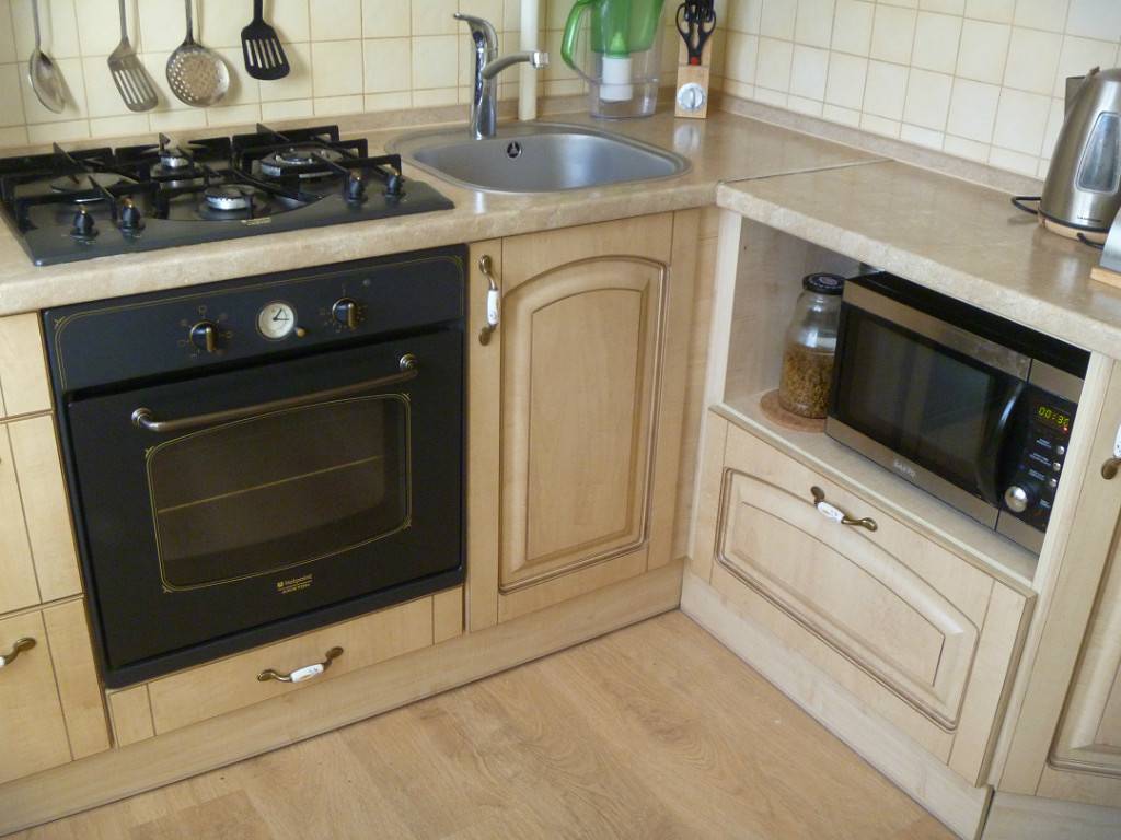 Чтобы микроволновая печь не занимала полезную площадь на рабочих поверхностях, ее можно убрать вниз – разместить под столешницей. Для этого необходимо заменить один из нижних шкафов кухонного гарнитура на нишу для микроволновки.