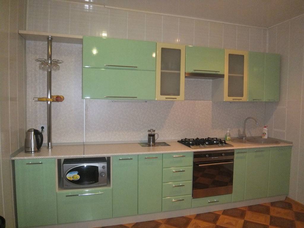 - если частично убрать заднюю стенку шкафа, туда можно спрятать трубы, счетчики, высокие размеры пенала, его достаточная глубина вполне позволяют скрыть неприглядные элементы кухни.