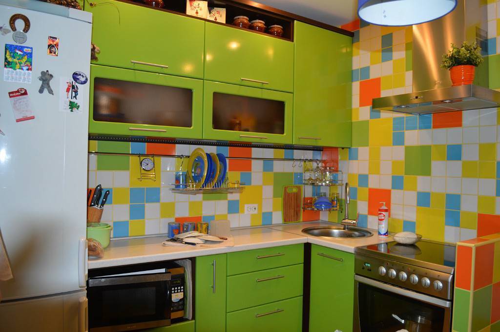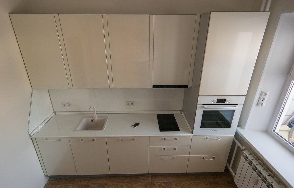 На фотографии выше мы наблюдаем недостаток рабочих поверхностей. Духовку стоило встроить под столешницу, а тумбу, в которой она находится сейчас, выполнить в стандартной высоте. Это было бы рациональнее