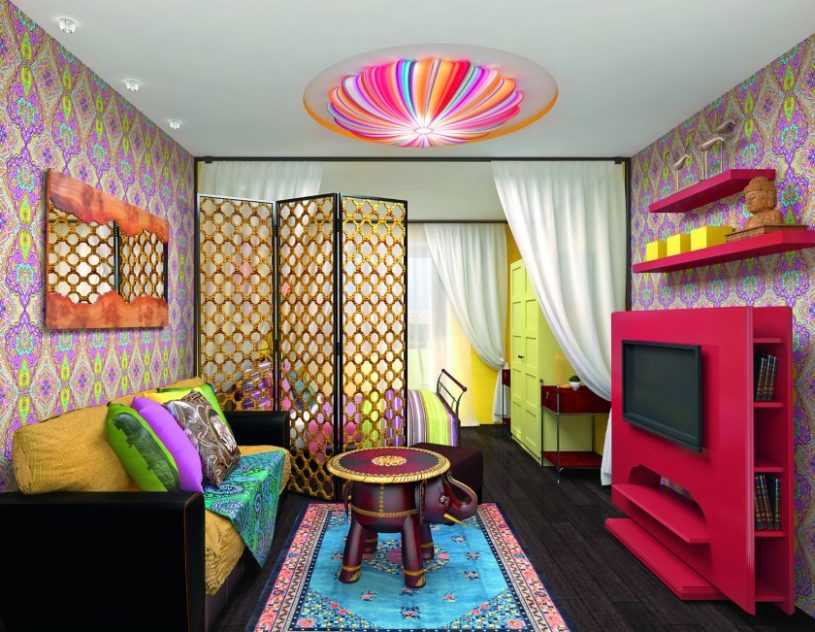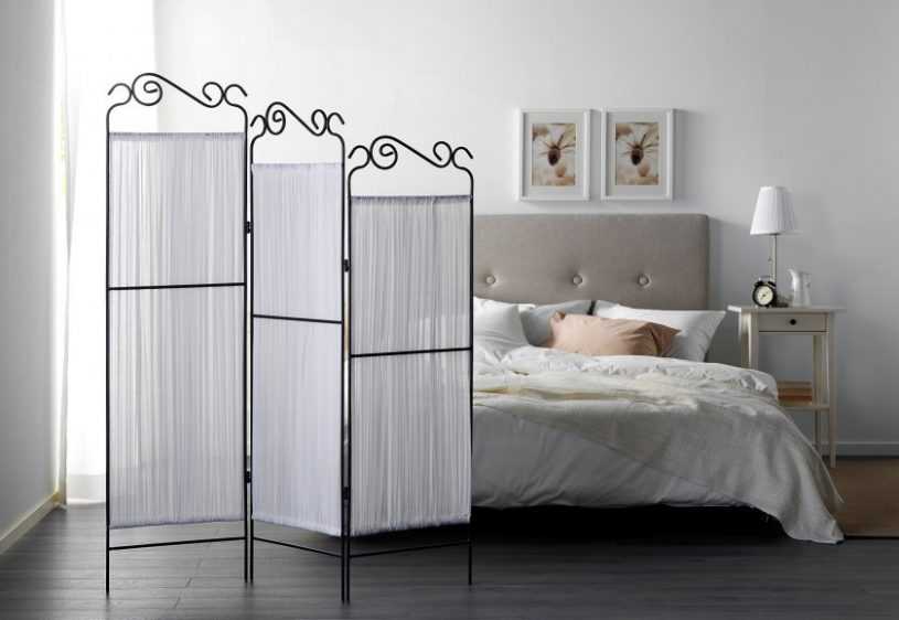 Если бюджет не позволяет заниматься сложным ремонтом, но решение изолировать кровать принято, ничего не остаётся, как отделить спальную зону от гостиной с помощью мобильной перегородки или плотной ширмы.