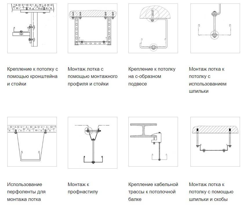 Монтаж перфорированных кабельных лотков к потолку имеет свои особенности. Способов закрепить конструкцию в этом случае больше, чем при креплении к стене. К основным методам фиксации относятся приведенные на схеме ниже.