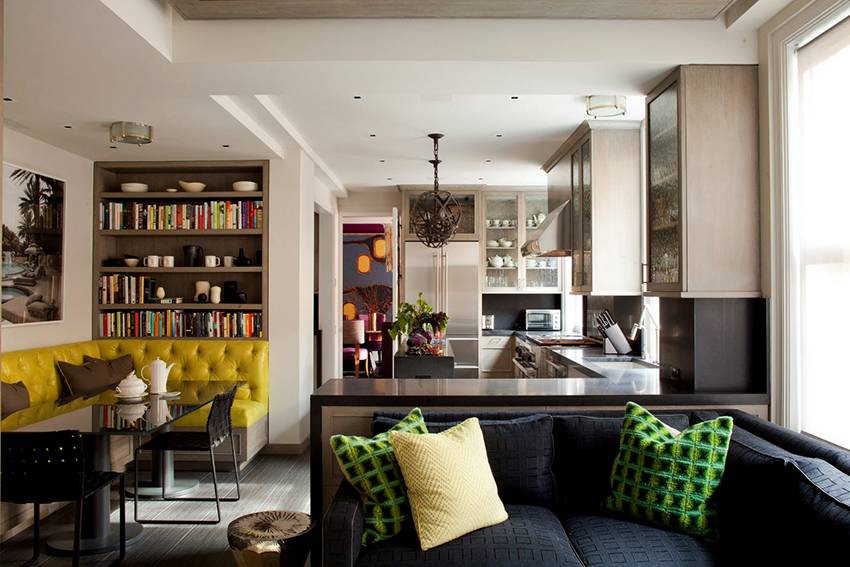А теперь давайте увидим интересные, продуманные, а также неудобные идеи как может выглядеть совмещенный интерьер небольшой кухни-гостиной.