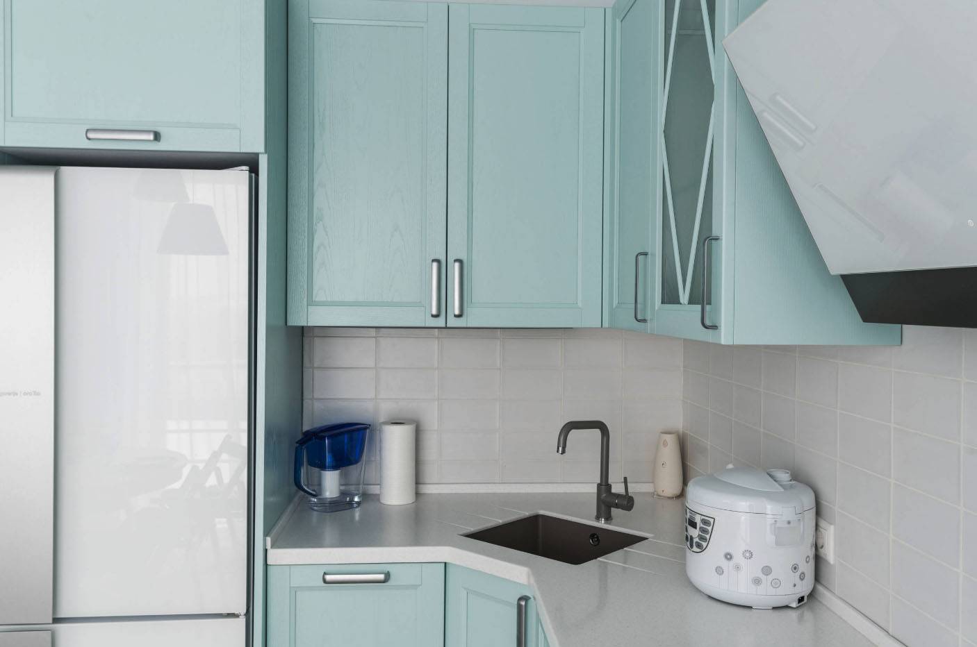 Мойку ставьте в углу. Чтобы она лучше стала, скосите уголок нижней тумбочки. Это обеспечит к ней свободный доступ, при этом квадратные метры останутся свободными. Угловая кухня в хрущевке с газовой колонкой будет отличным вариантом для людей, которые часто готовят, или же больших семей (3-4 человека).