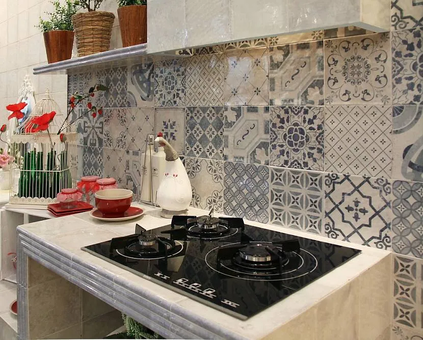 Кухонная плитка с большим количеством элементов понравится любителям ретро. Материал использовался хороший, поэтому небольшие повреждения и воздействие бытовой химии он выдержит без особых проблем. Подойдет для облицовки кухонного фартука и ванной комнаты, что также добавляет ему преимущества. Гармонично смотрится вместе с некоторыми современными решениями.