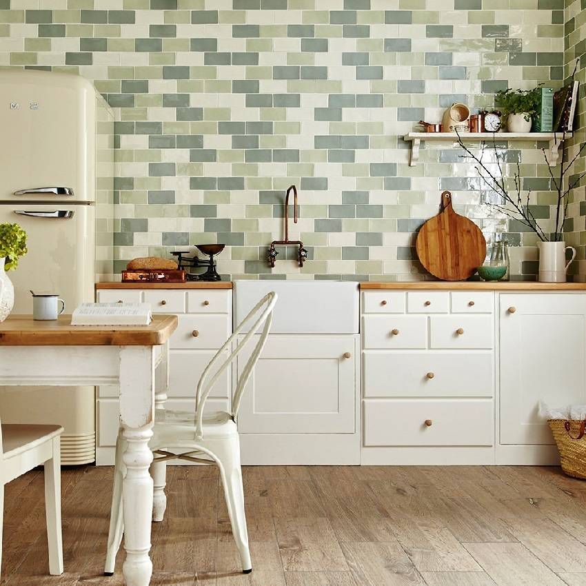 Пояс из плитки зеленого колера освежит практически любую комнату, вдохнет новую жизнь. Подойдет геометрия квадратной, прямоугольной формы, в виде кабанчика. Вид сочной молодой травы отлично впишется во многие стили.