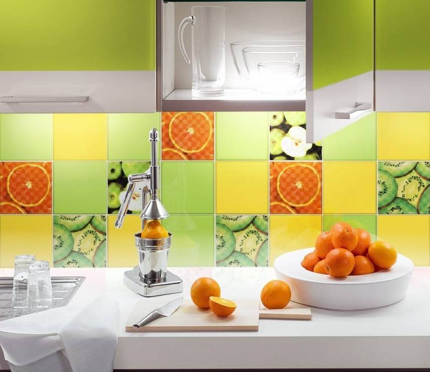 кафельная плитка для кухни отлично сочетается с плоскими вставками, оформленными рисунком. В данном случае укладка может быть точечной (элементы равномерно разбрасываются по все площади поверхности) или в виде отдельного панно;