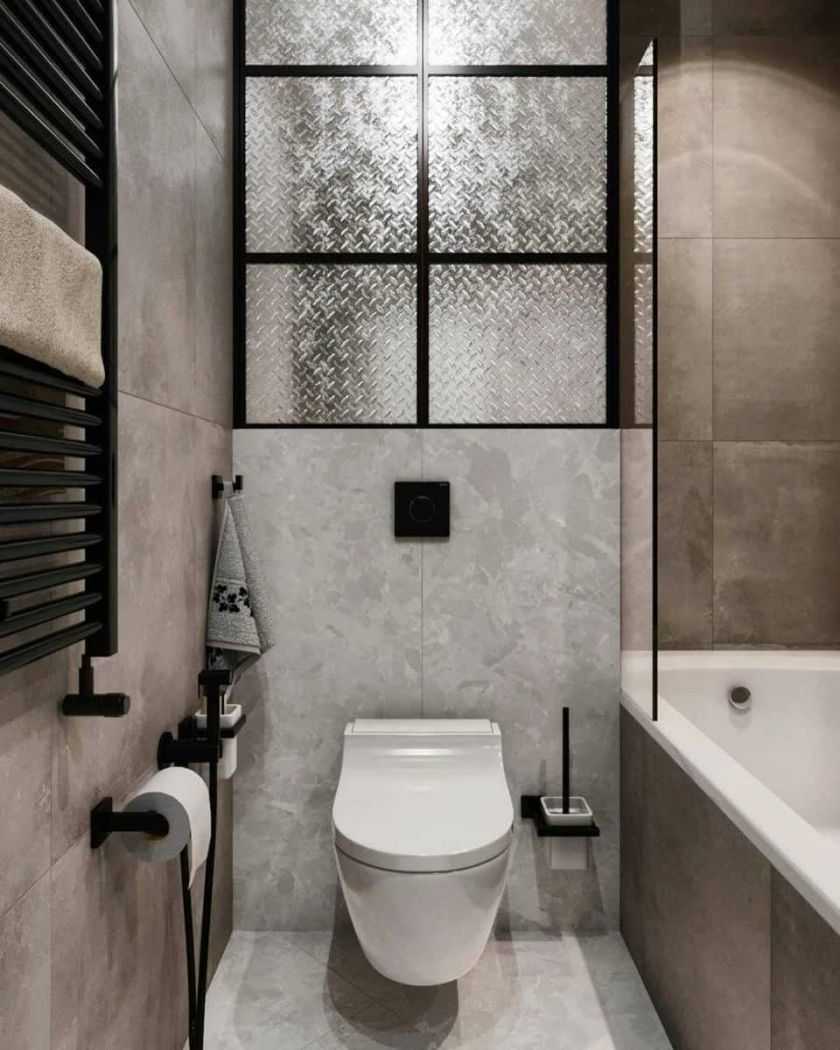 Темный потолок и пол делают помещение ниже и шире. Подвесной унитаз на узкой стенке напротив входа позволяет уменьшить длину помещения.