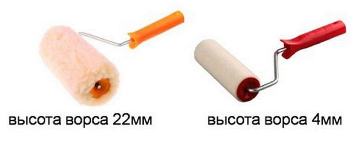 Широкий валик служит для закатки основной поверхности, маленьким раскатывают краску, нанесенную кистью. Это обусловлено тем, что фактура поверхностей, окрашенных кистью и валиком, отличается друг от друга. Если не раскатывать валиком красящий состав, нанесенный кистью, то визуально это место будет выглядеть темнее или светлее основной поверхности. Высота ворса валиков должна быть одинаковой.