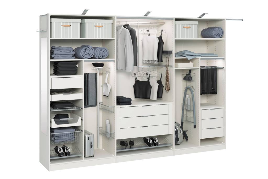 - модульные — собираются из отдельных блоков с разным наполнением (модулей). К плюсам модульных шкафов относятся возможность самостоятельно собрать конструкцию в соответствии со своими потребностями, а так же рационально обустроить пространство прихожей, заняв минимум места.