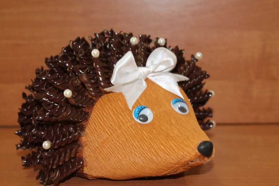 - Украшаем ёжика. На носик приклеить ракушку, глаза сделать из бусинок и маленький бантик перед иголками. Конечно, нужно не забыть приклеить бусинки на иголки ёжика. И теперь поделка готова.