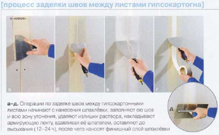 Данный процесс очень важен, поскольку именно так гипсокартон прослужит вам гораздо дольше. Заделывать нужно все щели, не только заводские стыки, но и образовавшиеся по случайности. Процесс это несложный: нанесите первый слой шпаклевки широким шпателем по всей длине стыка и приложите к нему, вдавливая, кусок сетки (либо приклейте его). Наконец, нанесите второй, финишный слой шпатлевки и сравняйте поверхность. Не забудьте также обработать и углы.