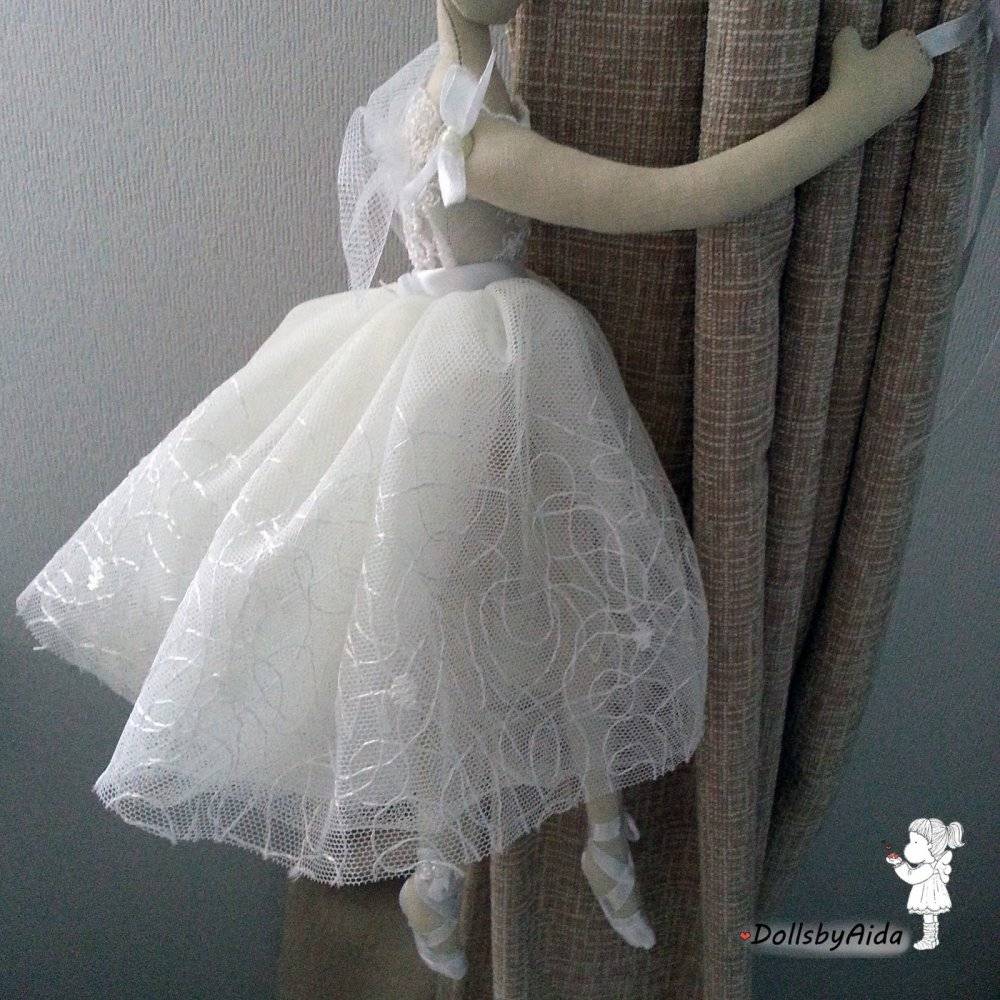 Несколькими швами соедините руки и туловище, шея должна попасть в проем, сквозь который вы наполняли голову, затем ткань из головы аккуратно пришейте к шее. Старайтесь несколько повернуть голову в сторону, чтобы кукла смотрела в комнату, а не зарылась лицом в гардину. Если вы шьете две куклы для штор, их головы должны быть симметрично повернуты. Затем прикрепите конечности.