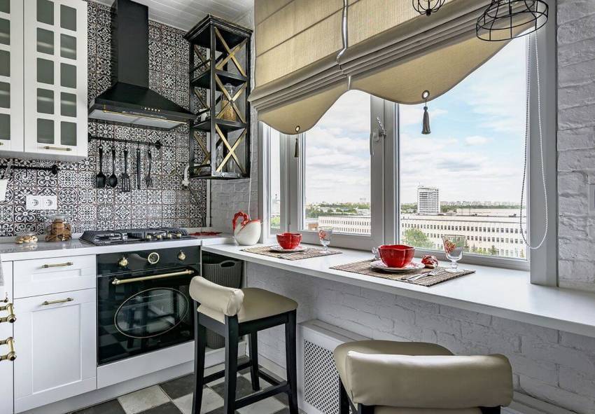 Если же столешница выше подоконника, лучше всего попросту заложить часть проема окна кирпичами и заказать меньшее окно. Однако такое решение подойдет только для частных домов. Что касается квартиры, такое действие является нарушением закона, поскольку влечет за собой изменение архитектурного облика строения.