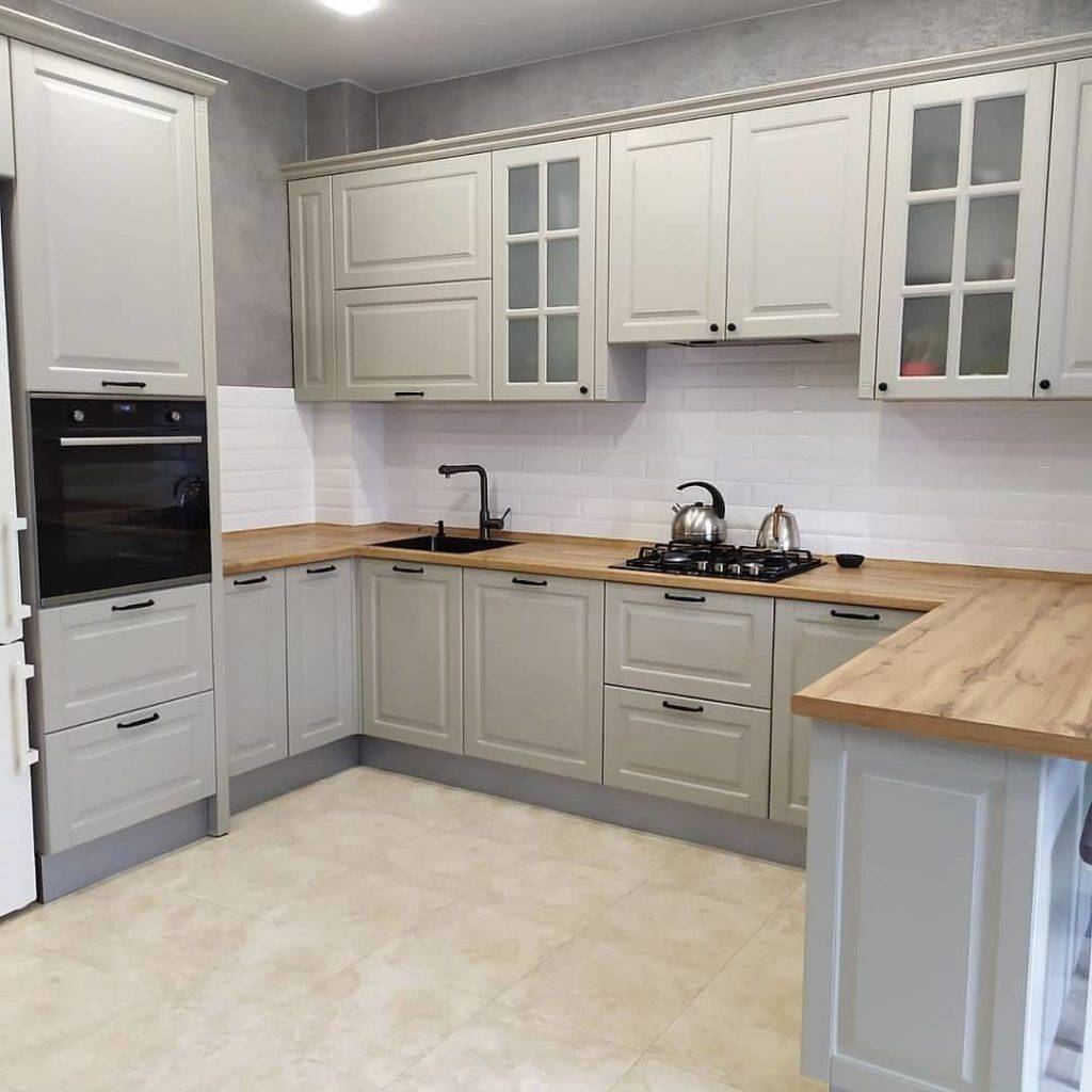 Угловая, когда мебель размещается Г-образно. Кухни такого типа довольно функциональны и вместительны даже для маленьких помещений. И особенно стильно смотрятся варианты “до потолка”. Соответственно и цена будет повыше такого гарнитура.