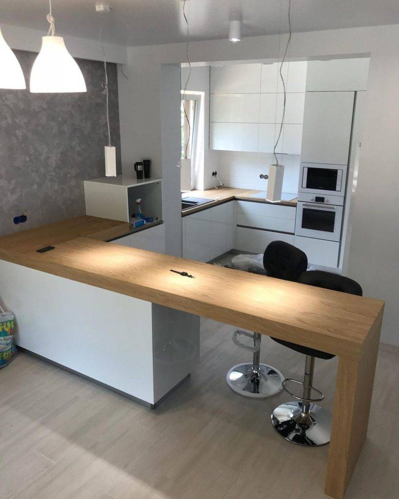 G-образная планировка кухни напоминает предыдущий тип компоновки мебели, но при этом есть место небольшой четвертой стороне, роль которой чаще всего играет барная стойка. В зависимости от площади кухни, она может быть границей рабочей и столовой зоны или же обеденным столом;