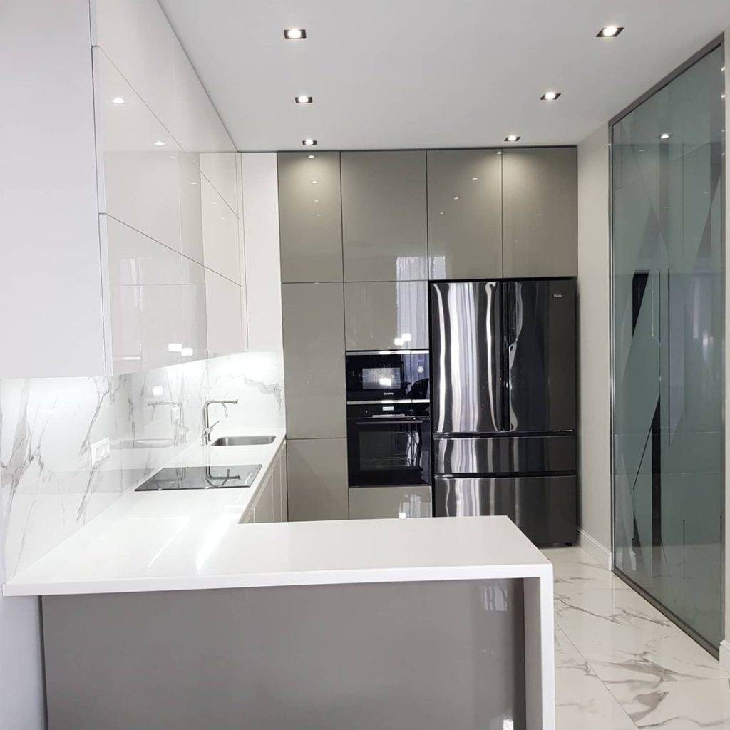 - Для узких маленьких кухонь размером всего 8 кв. метров лучше выбирать угловую планировку или размещать гарнитур с холодильником вдоль одной стены. Другие варианты занимают слишком большую площадь, не оставляя пространства для свободного передвижения.