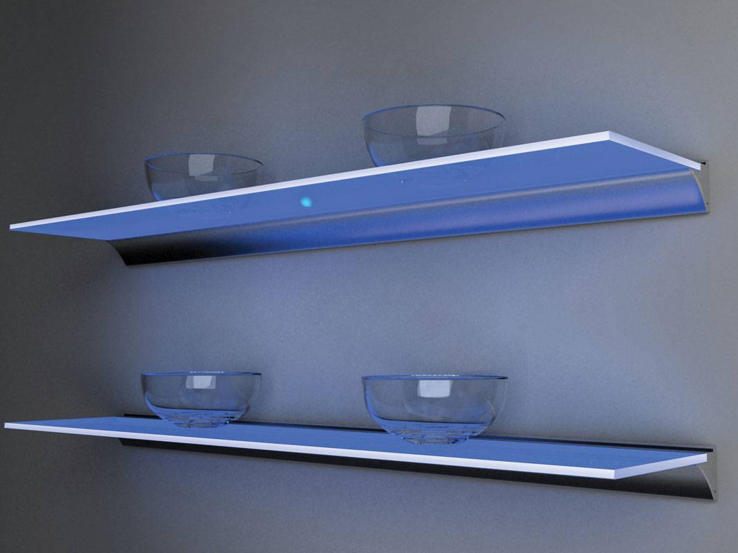 Стеклянная полка с подсветкой, цвет которой можно подобрать в соответствии с вашим дизайном. Кроме того, это устройство выполняет функцию поддерживания полки. Подойдет для подсветки элементов примыкающих к шкафу купе.