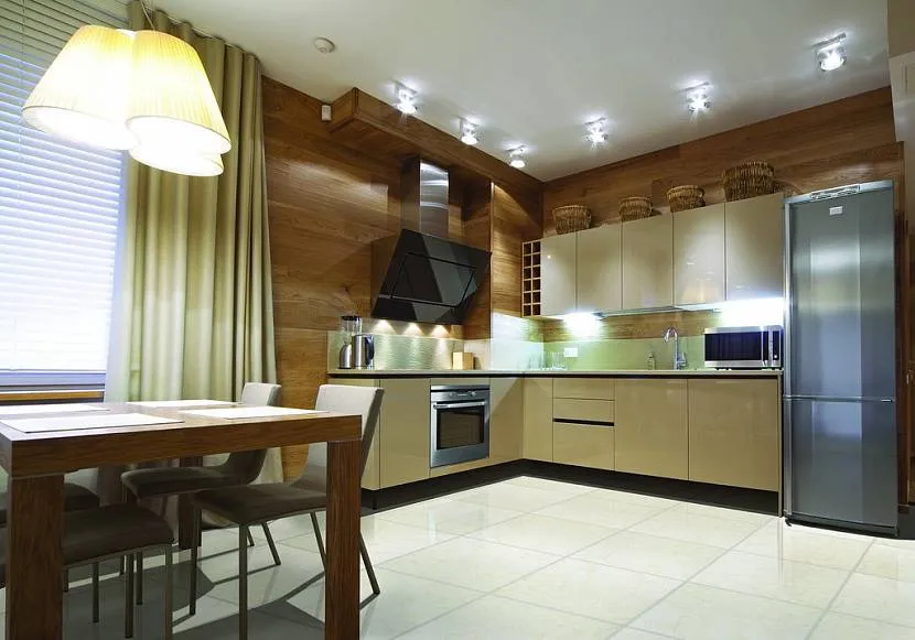 - Центральная лампа, размещенная на потолке, и являющаяся единственным источником света, будет удобна только в обеденной зоне. Поэтому к месту готовки приходится протягивать дополнительное освещение в виде светодиодных лент или экономных ламп.