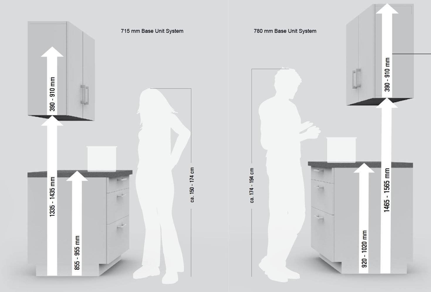 Далеко не все люди обладают средним ростом. А производители выпускают мебель, далекую от стандартов. Если рост хозяев 168 и 172 см, что не относится к стандартным показателям, или выбран нестандартный мебельный гарнитур, рассматриваются другие варианты определения расстояния от столешницы до верхнего яруса.