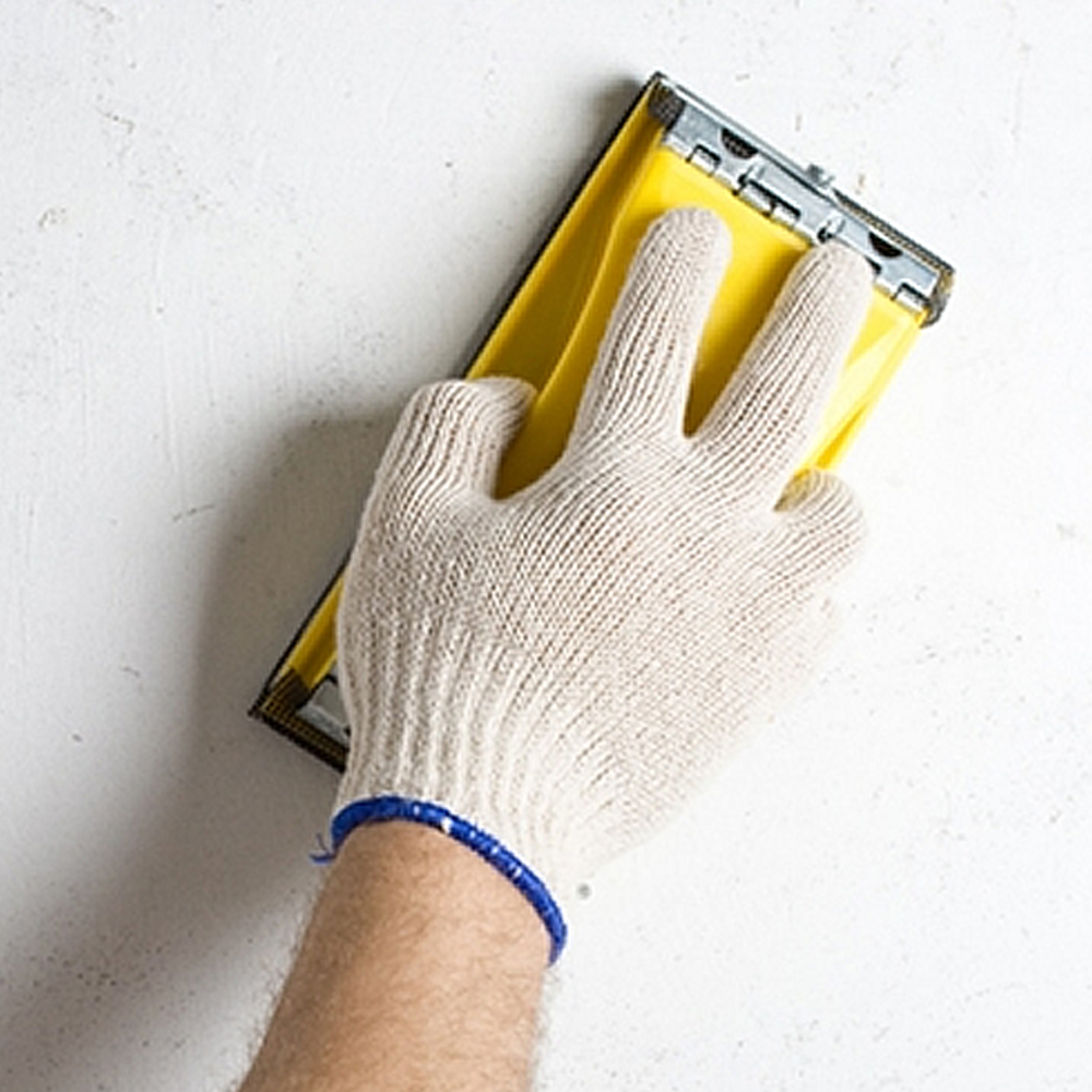 Высохшую шпаклевку необходимо отшлифовать. Для работы можно взять ручную терку с прикрепленной мелкозернистой наждачной бумагой или шлифовальную машинку. Механическое шлифование может привести к повреждению бумажного слоя ГКЛ, ручной способ дает возможность контролировать нажим. Проверить результат можно с помощью фонарика, свет, падающий под небольшим углом, выделит тенью любую шероховатость.
