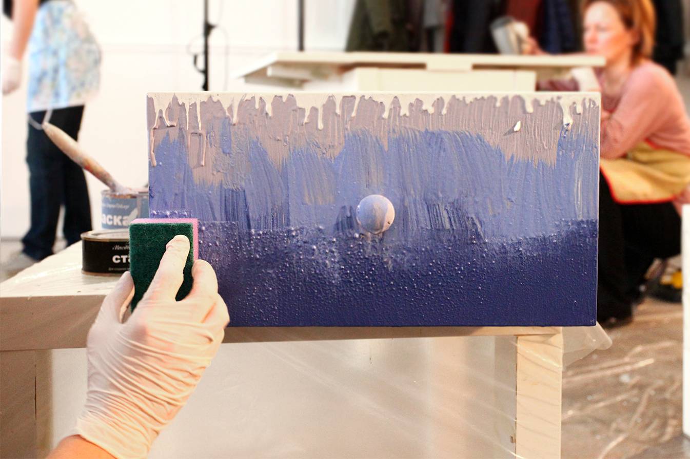 Чтобы создать градиент, понадобятся краски и обычная губка для мытья посуды. Сначала нужно нанести полосами цвета, из которых будет состоять градиент. Затем, не дожидаясь, пока краска высохнет, начать избавляться от резкой границы между цветами: похлопывающими движениями губкой переносить цвет на соседний. Двигаться стоит как снизу вверх, как и сверху вниз, используя разные губки (или разные стороны губки) для разных концов градиента. Если оказывается, что нужный цвет потерялся или стал слишком бледным, можно добавить соответствующей краски. Конечно, проще сделать переход из одного цвета в цвет фона, но можно добиться и радужных переливов, все зависит от терпения и желания.