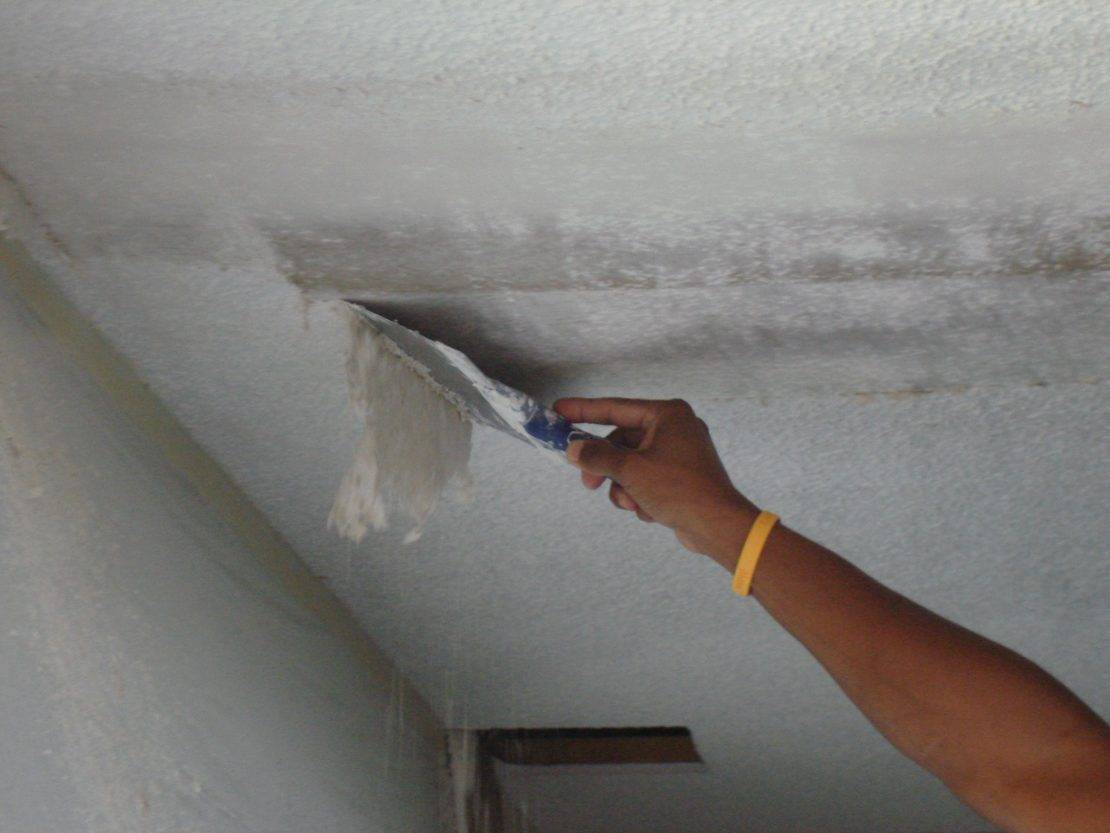 Сначала потолок очищают от старой отделки. Побелку смывают мыльной водой или счищают шпателем. Старые обои хорошо смачивают и тоже убирают шпателем. Плитку из пенопласта сдирают вместе с клеем. Влагостойкие краски смывают специальным растворителем