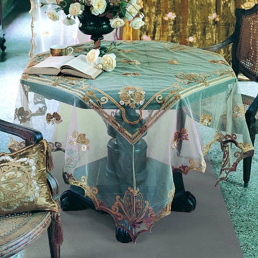 - Помещение. Чтобы изделие смотрелось в интерьере гармонично, то в первую очередь следует решить, в какой комнате оно будет располагаться. Если это будет стол в гостиной, то можно взять слегка вычурную ткань, с небольшой пышностью — она скажет о хорошем вкусе хозяев дома. Если это парадная комната, то лучше не экономить, а взять дорогую качественную скатерть. Например, хорошо будет смотреться матовый атлас с кружевом по краю, вышивкой гладью или мережкой. Самое главное, чтобы цвет гармонировал со всем интерьером. Для кухни скатерть должна быть максимально практичной, не бояться стирок, не впитывать в себя воду и ни в коем случае не скользить.