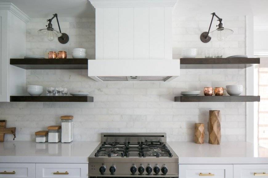 Открытые полки для интерьера кухни имеют различные дизайнерские решения.