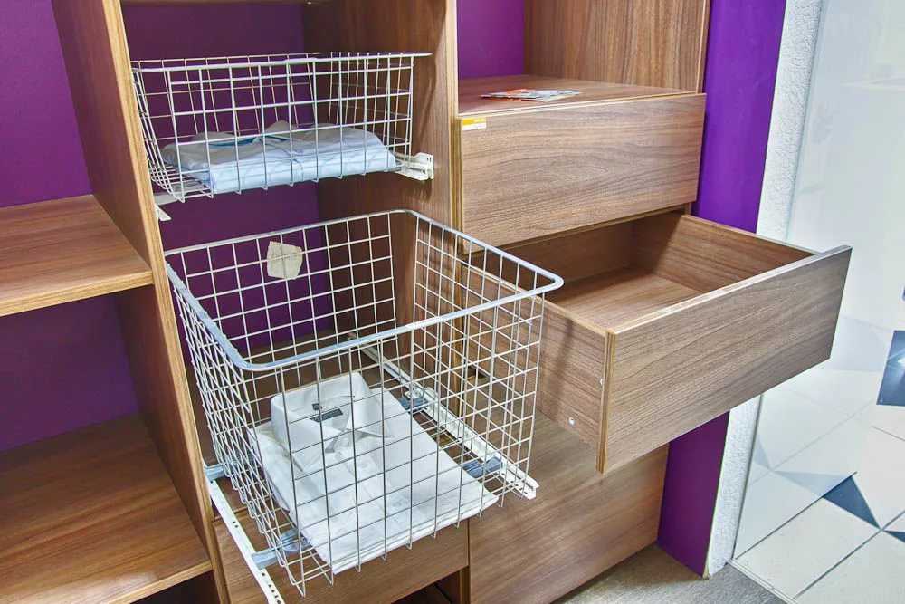 Выдвижные ящики | Аналог сетчатой выдвижной корзины, но выполнен из дерева или пластика, чаще всего используется в закрытых гардеробах. |