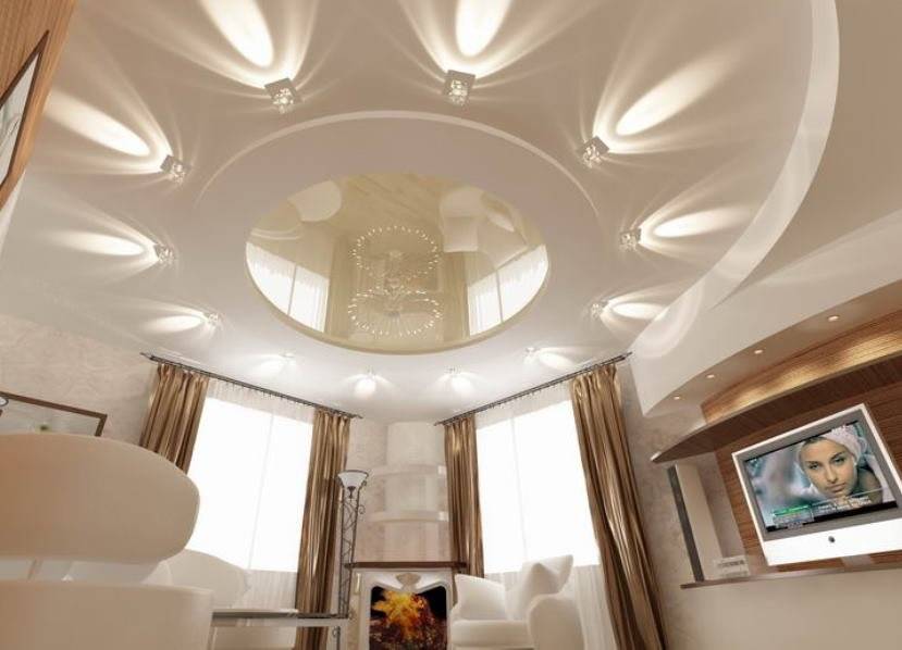 сложные фигуры – имеется в виду 2 или 3 ярус, включающий несколько разнородных элементов и составляющих некоторое единое целое. Это может быть узнаваемое изображение – цветок, солнце с лучами, бабочка, или абстрактное. К такому приему нередко прибегают при декоре детской. Однако и в гостиной в стиле хай-тек можно встретить столь необычный вариант. Потолок из гипсокартона на фото — в зале в частном доме — относится к этой категории.