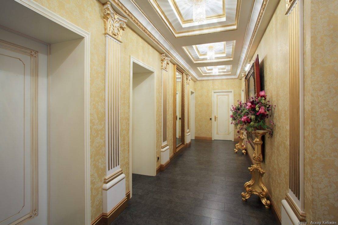 - Детали. Если квартира большая, прихожая тоже объемная, то ограничений в применении орнаментов, лепнины, прочих деталей нет. Это может быть геометрически ровная фигура или криволинейные арки, вырезанные из пенопласта фрагменты или лепные пилястры, колонны.