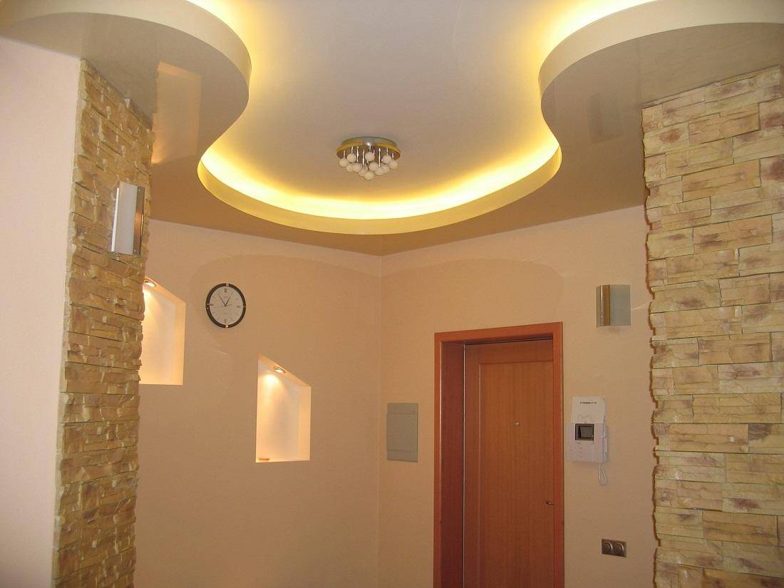 - можно создавать многоуровневые потолки, придавать конструкциям интересную форму, но подобное решение доступно лишь в высоких просторных прихожих, миниатюрное пространство многоуровневая конструкция превратит в самую настоящую нору;