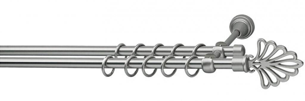Первую позицию нашего топ рейтинга занимает двухрядная потолочная модель, изготовленная полностью из хромированного металла. Смотрится дорого, винтажно, выдерживает большой вес штор.