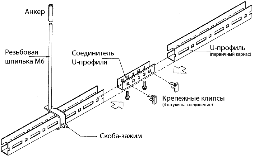 а) U-профили сращиваются между собой при помощи 2-х штук крепежных клипс BPM 300120 и 2-х болтов.