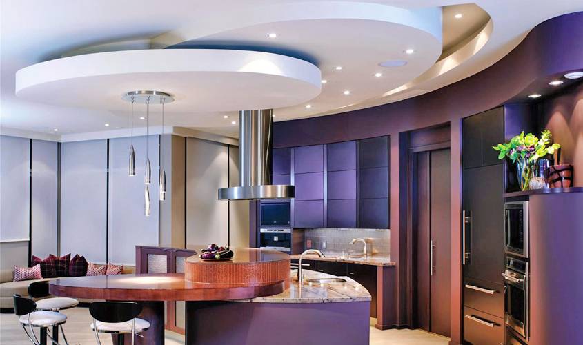 Многоуровневые, как, впрочем, и двухуровневые конструкции не подходят для монтажа в маленьких помещениях так как система будет нависать сверху, лишая комнату «воздуха». Чтобы решить эту проблему можно сделать перепланировку, например, соединить меж собой гостиную и кухню. В этом случае прекрасно будет смотреться дизайн гипсокартонного потолка на кухне с эффектом зонирования.