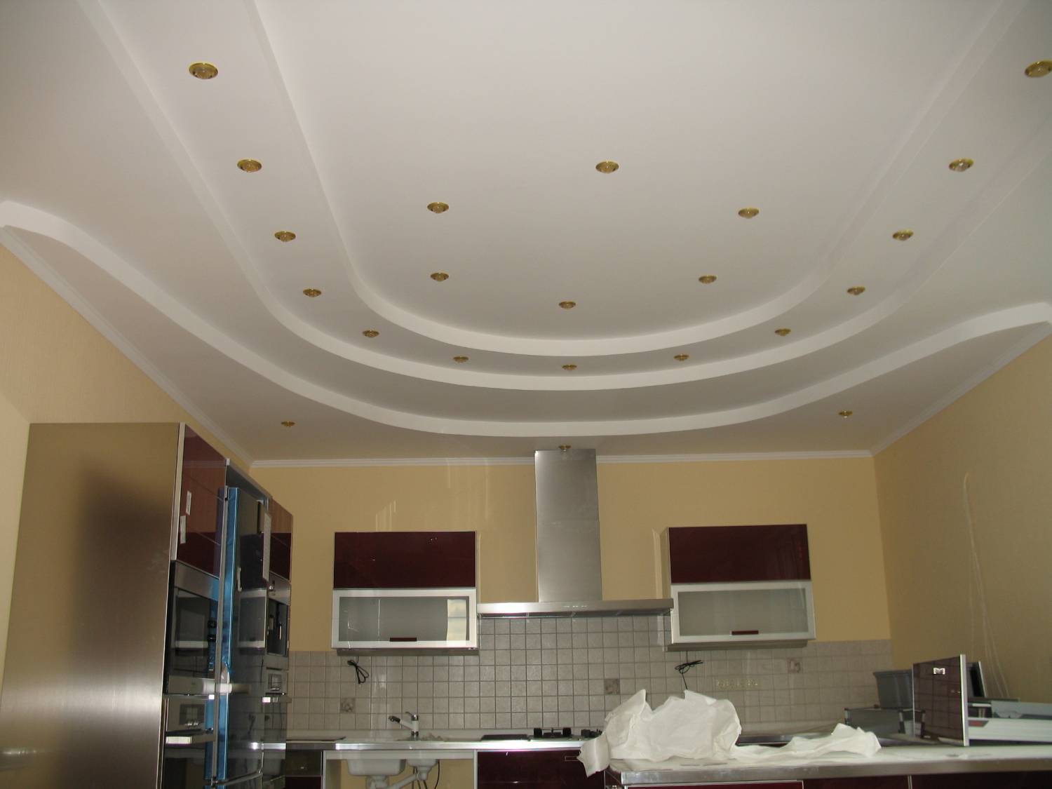 Дизайн двухуровневых потолков на кухне также бывает разным по форме: