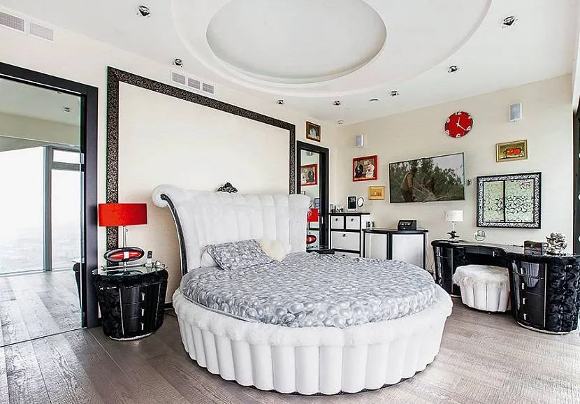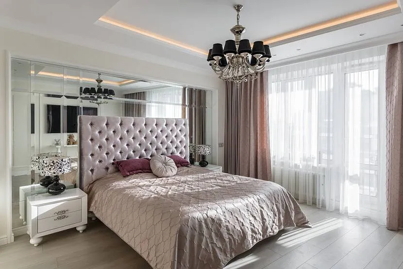С точки зрения автора, оптимальная конструкция такого потолка — имеющий максимальную высоту потолок в центре комнаты, и потолочный короб со встроенными светильниками по периметру спальни. Короб переходит в нишу со скрытой подсветкой.