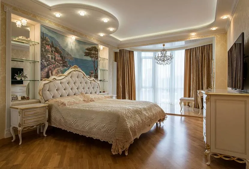 Прованс – это стиль, который включает в себя нежность и романтику, а также использование цветочных мотивов и пастельных оттенков. В такой спальне стоит использовать потолки с белой лепниной и розами, которые будут создавать атмосферу уюта и комфорта.