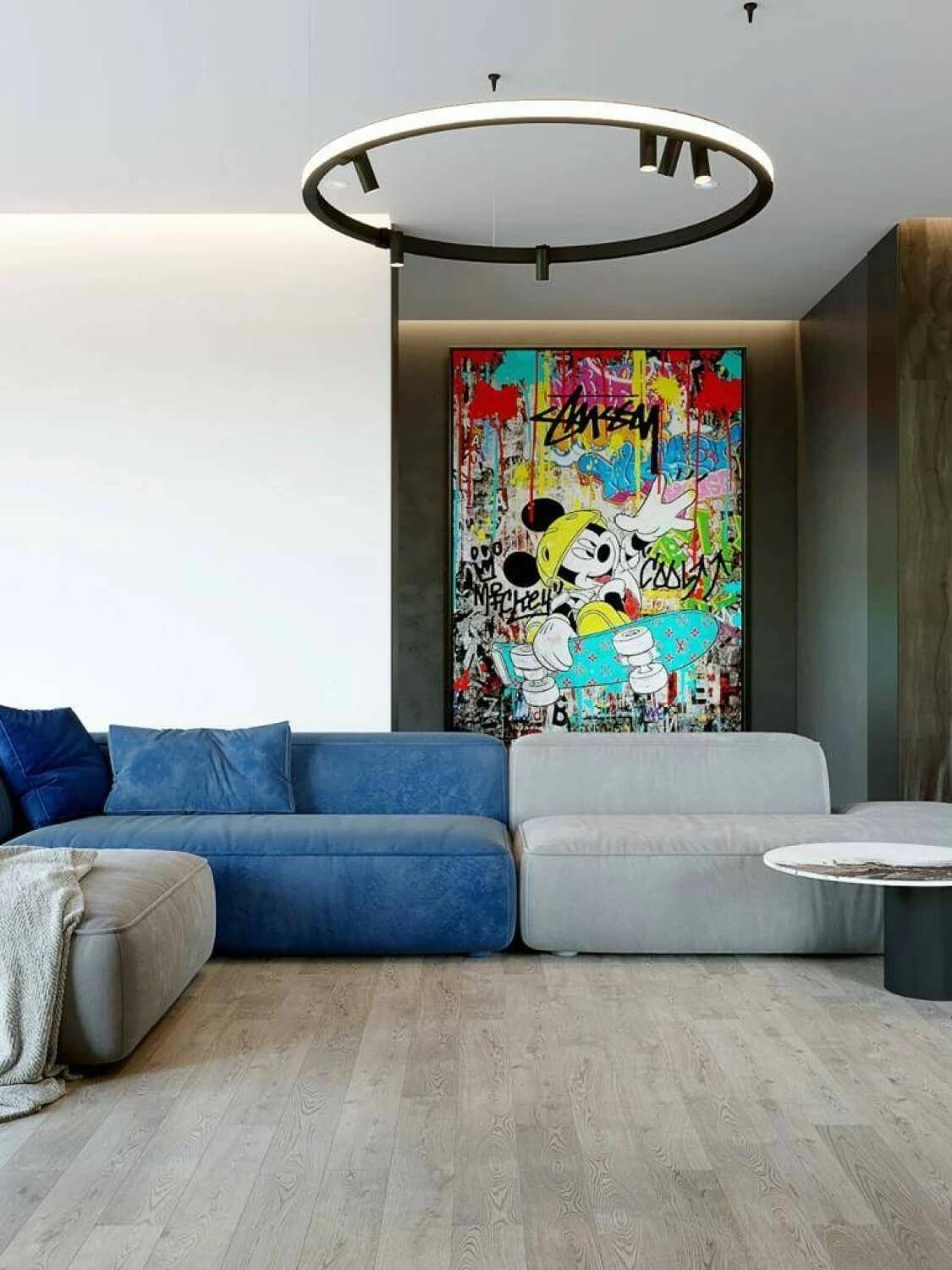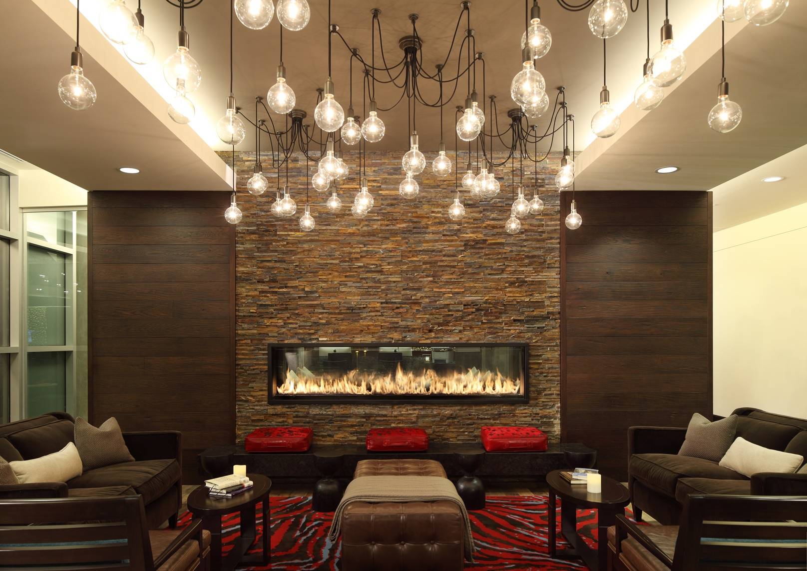 Для больших и просторных помещений не лишним будет использование ярких акцентов. К примеру, разноцветные граффити на стенах, цветной текстиль, необычный огонь в камине, а также ковры и огромные люстры.