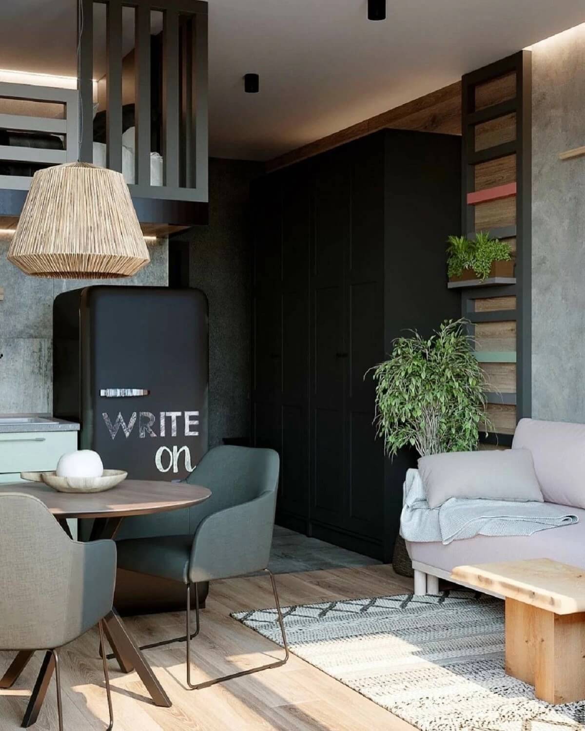 Собственноручно выкрашенный холодильник и декоративная лесенка-этажерка — такие решения подвластны практически каждому. Проект квартиры-студии «25 квадратов», дизайнер Павел Алексеев