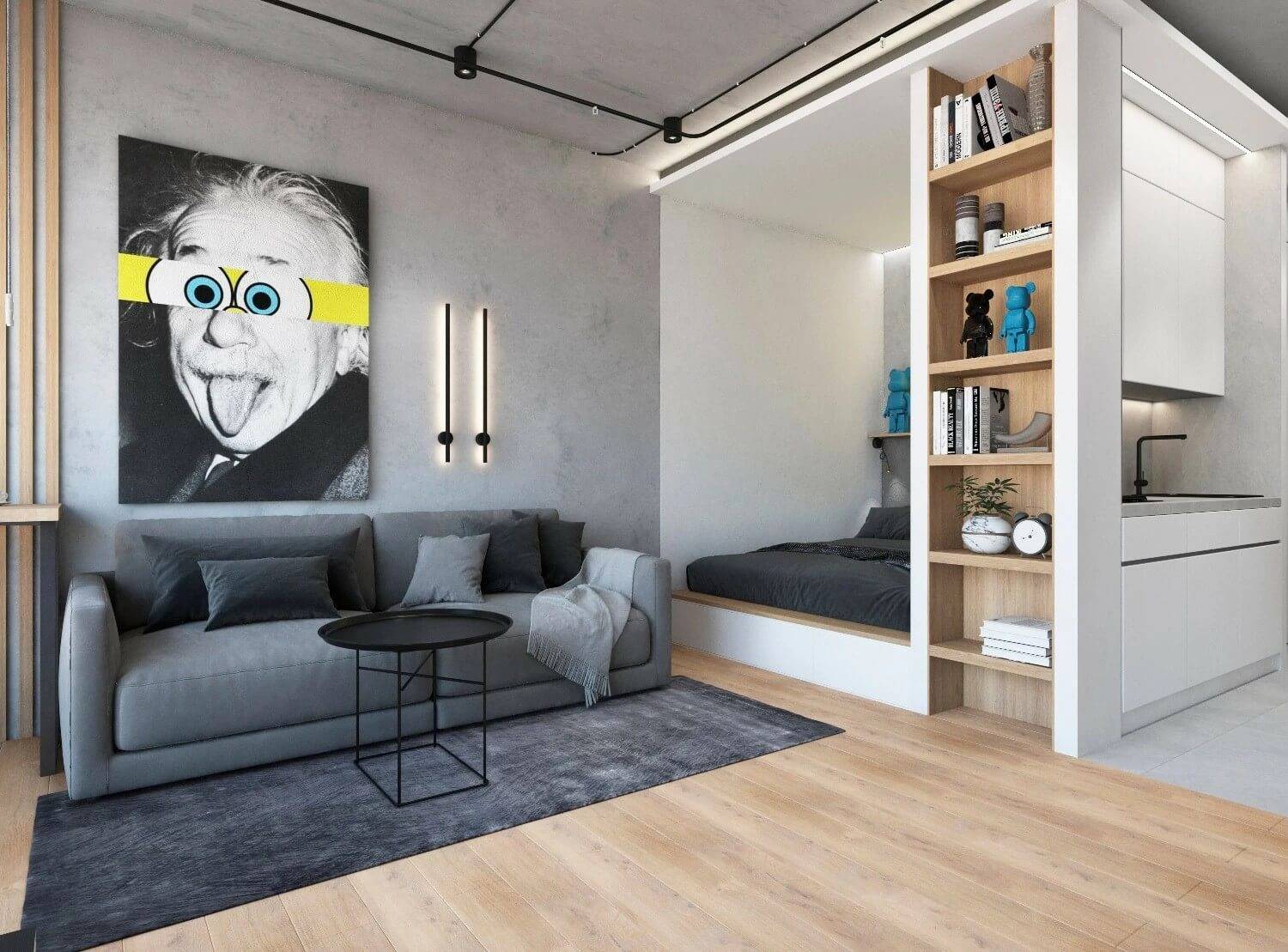 Открытое пространство, где соединены гостиная, спальная и кухонная зоны, открытые коммуникации на потолке, грубо оштукатуренная стена придают небольшой комнате атмосферу лофта. Проект квартиры-студии для молодого человека, дизайнер Светлана Шалыго