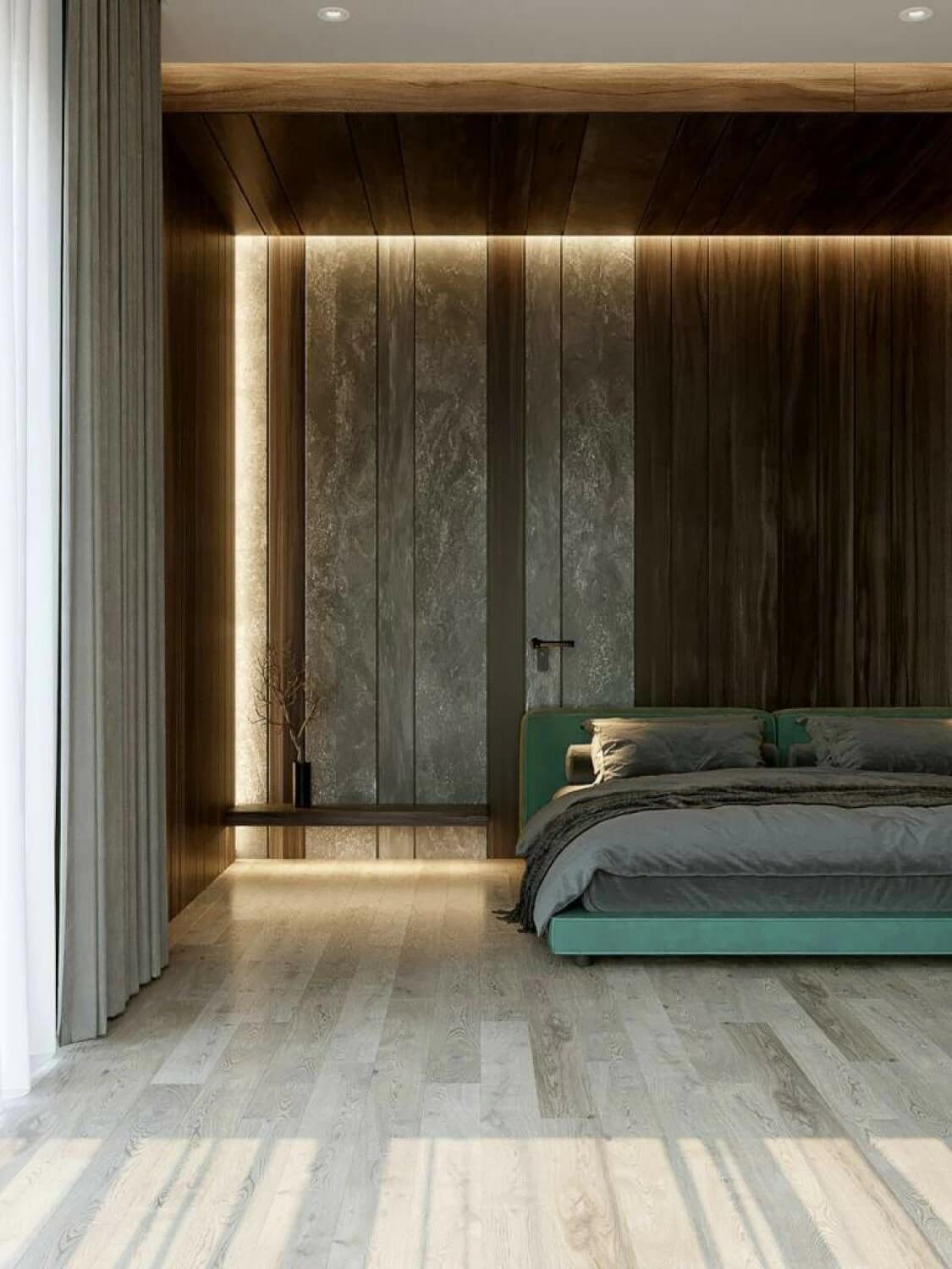 Спальня выстроена на контрасте цветов и фактур смежных стен. Проект квартиры «02», дизайнер Елизавета Ашкенази