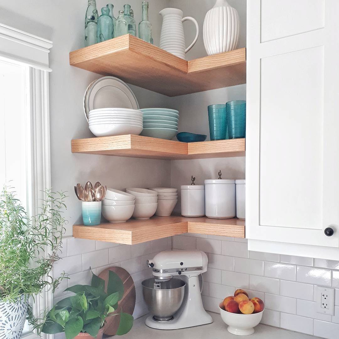 Светлую угловую кухню можно оборудовать открытыми полками. Кроме того, это