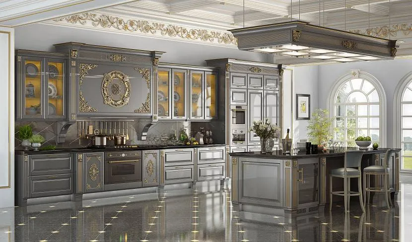 - Классический стиль подходит для просторных помещений. Он придает любому интерьеру царственности и величественности. Кухонные гарнитуры отличаются узорчатыми рисунками на фасадах, винтажными стеклами.