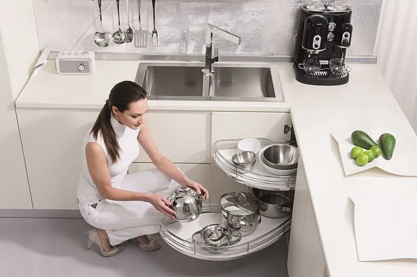 Среди остальных преимуществ гарнитура Г-образной конфигурации можно назвать вместительность. В угловых отделениях часто используют вращающиеся системы хранения. В таком шкафу можно разместить много полезной утвари, даже в условиях экономии пространства. Столешницу углового гарнитура можно использовать как зону готовки и как обеденную.
